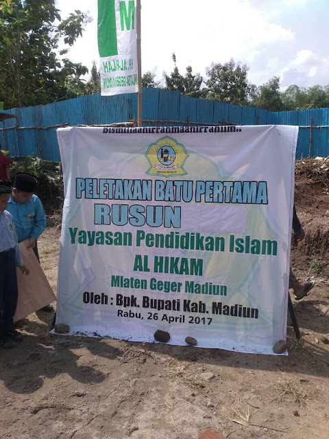 Kab. Madiun (Inmas) Kepala Kantor Kementerian Agama Kab. Madiun H.M. Sakur hadiri peletakan batu pertama pembangunan Rusun Yayasan Pendidikan Islam di Pondok Pesantren AL HIKAM Desa Mlaten, Kecamatan Geger Madiun oleh Bupati Madiun, Rabu (26/4). Turut hadir di acara tesebut Forpimda Kabupaten Madiun, Kyai-kyai SepuH, Kepala KUA Kecamatan Geger dan Camat Geger beserta anggota Muspika.